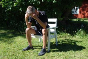 - Sitt i ”kuskställning” med underarmarna/armbågarna stödda mot knäna. Vila huvudet i händerna.